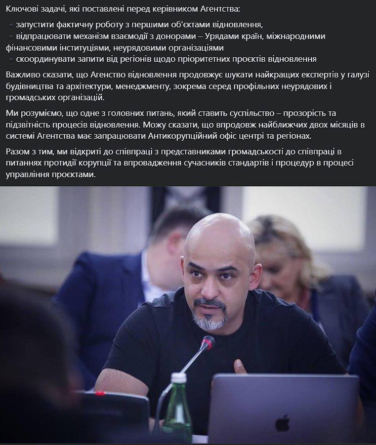 "Ключевые задачи, поставленные перед руководителем Агентства: запустить фактическую работу с первыми объектами восстановления, отработать механизм взаимодействия с донорами – правительствами стран, международными финансовыми институтами, неправительственными организациями, скоординировать запросы от регионов относительно приоритетных проектов восстановления", - написал Кубраков.