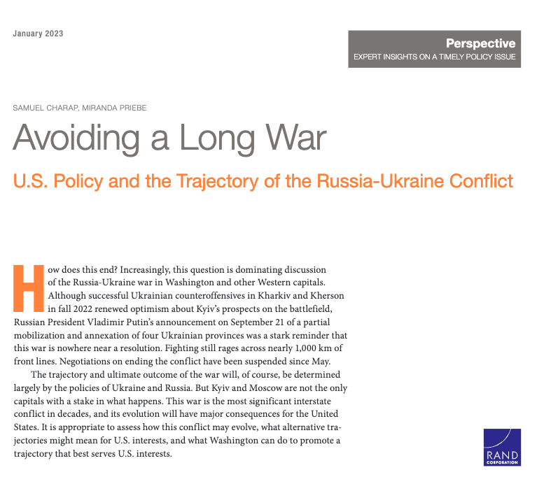 Известный американский исследовательский центр RAND corporation (среди его клиентов - Пентагон) в своем докладе "Избежать долгой войны" приходит к выводу о том, что ни одна из сторон в войне в Украине не достигнет "абсолютной победы".