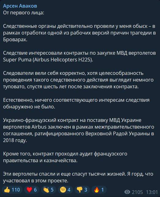 "Украино-французский контракт на поставку МВД Украине вертолетов Airbus заключен в рамках межправительственного соглашения, ратифицированного Верховной Радой Украины в 2018 году. Кроме того, контракт проходил аудит французского правительства и казначейства. Эти вертолеты спасли и еще спасут тысячи жизней. Я горд, что участвовал в этом проекте", - добавил Аваков.