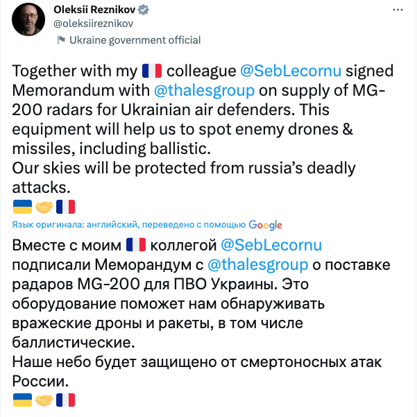 "Это оборудование поможет нам обнаруживать вражеские дроны и ракеты, в том числе баллистические", – написал министр.