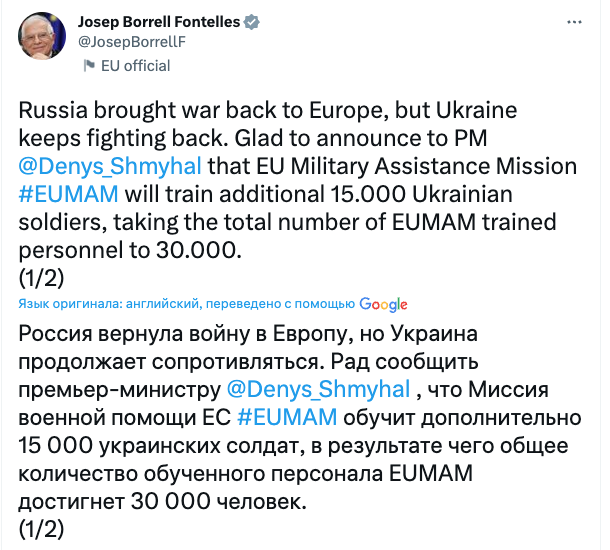"Рад сообщить премьер-министру Денису Шмыгалю, что Миссия военной помощи ЕС обучит дополнительно 15 000 украинских солдат, в результате чего общее количество обученного персонала EU MAM достигнет 30 000 человек", - написал дипломат.