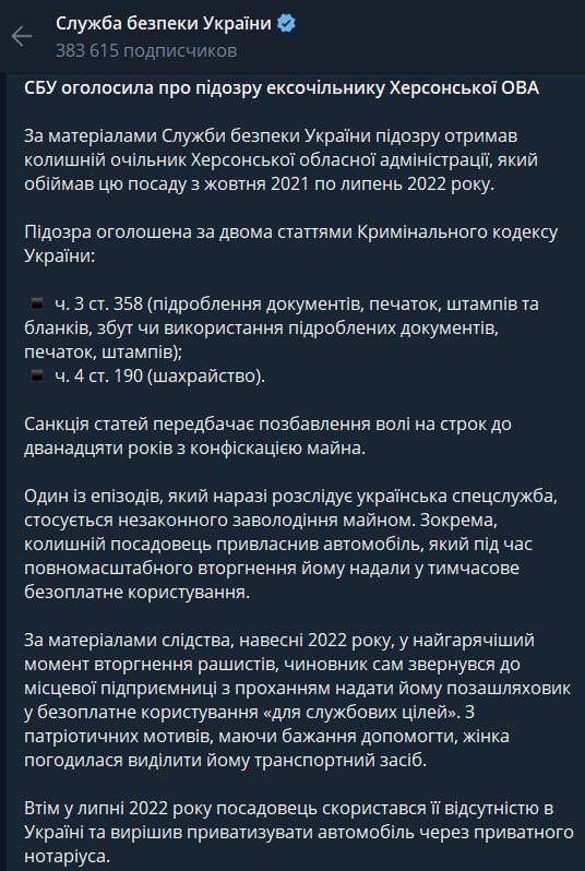 Подозрение, по данным СБУ, объявили по статьям УК о мошенничестве и подделке документов.