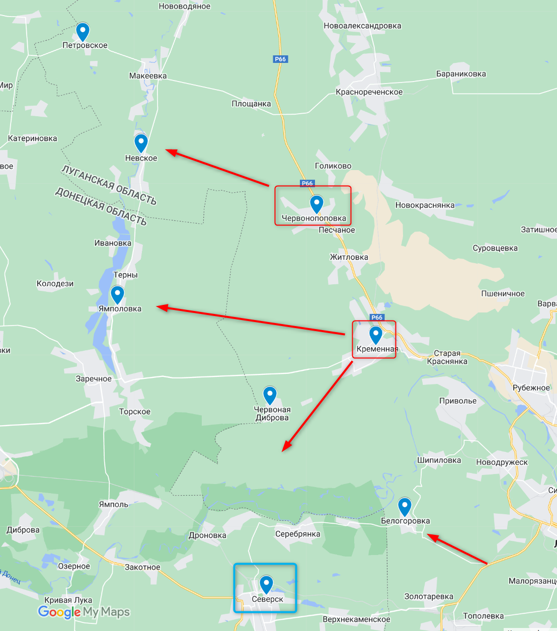 Российские телеграм-каналы заявляют, что наступление РФ идет на рубеже Червонопоповка - Кременная. Пишут о продвижении до Ямполовки (чего Украина не подтверждает) и на юго-запад от Червоной Дибровы в район Серебрянского лесничества (Генштаб подтверждал бои в этом районе).