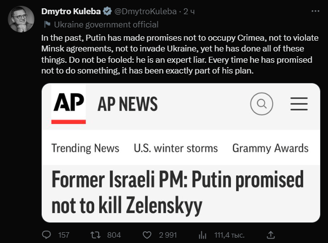 "В прошлом Путин давал обещания не оккупировать Крым, не нарушать Минские соглашения, не вторгаться в Украину, но все это он сделал. Не дайте себя обмануть: он искусный лжец. Каждый раз, когда он обещал чего-то не делать, это было частью его плана", - написал Кулеба в Твиттере.