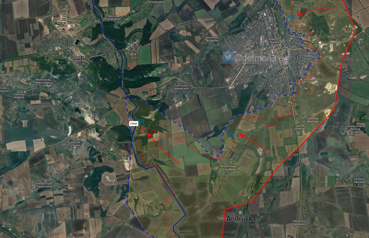 Также DefMon публикует карту сражений к юго-западу от Бахмута, где противник, по данным блогера, пытается выйти на трассу Бахмут-Константиновка - а именно, на дорожную развязку в сторону Часов Яра.