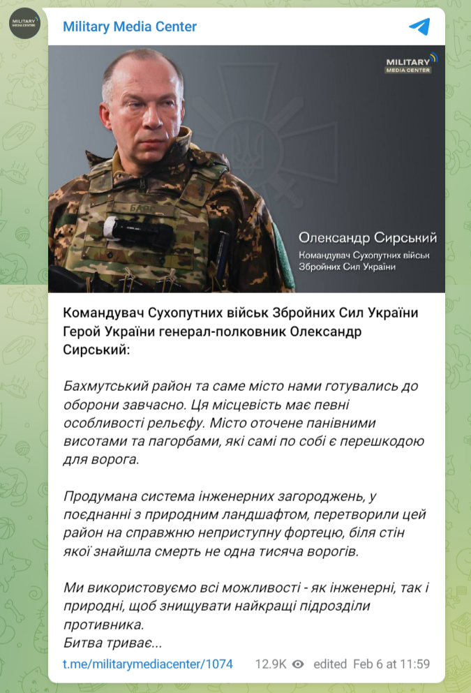Бахмут является "неприступной крепостью" благодаря выстроенной системе инженерных заграждений и природному рельефу, заявил командующий Сухопутными войсками ВСУ Александр Сырский.