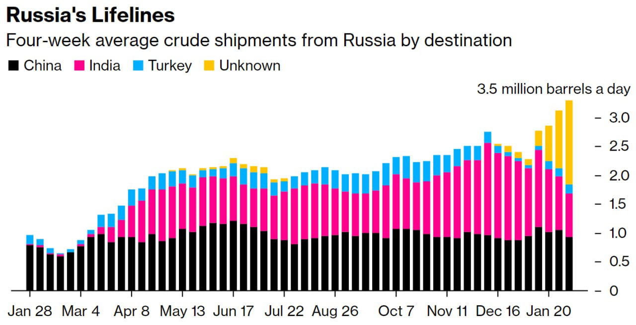 Объем сырой нефти, поставляемой Россией морем в Китай, Индию и Турцию, составил за месяц до 3 февраля 3,29 млн баррелей в день.