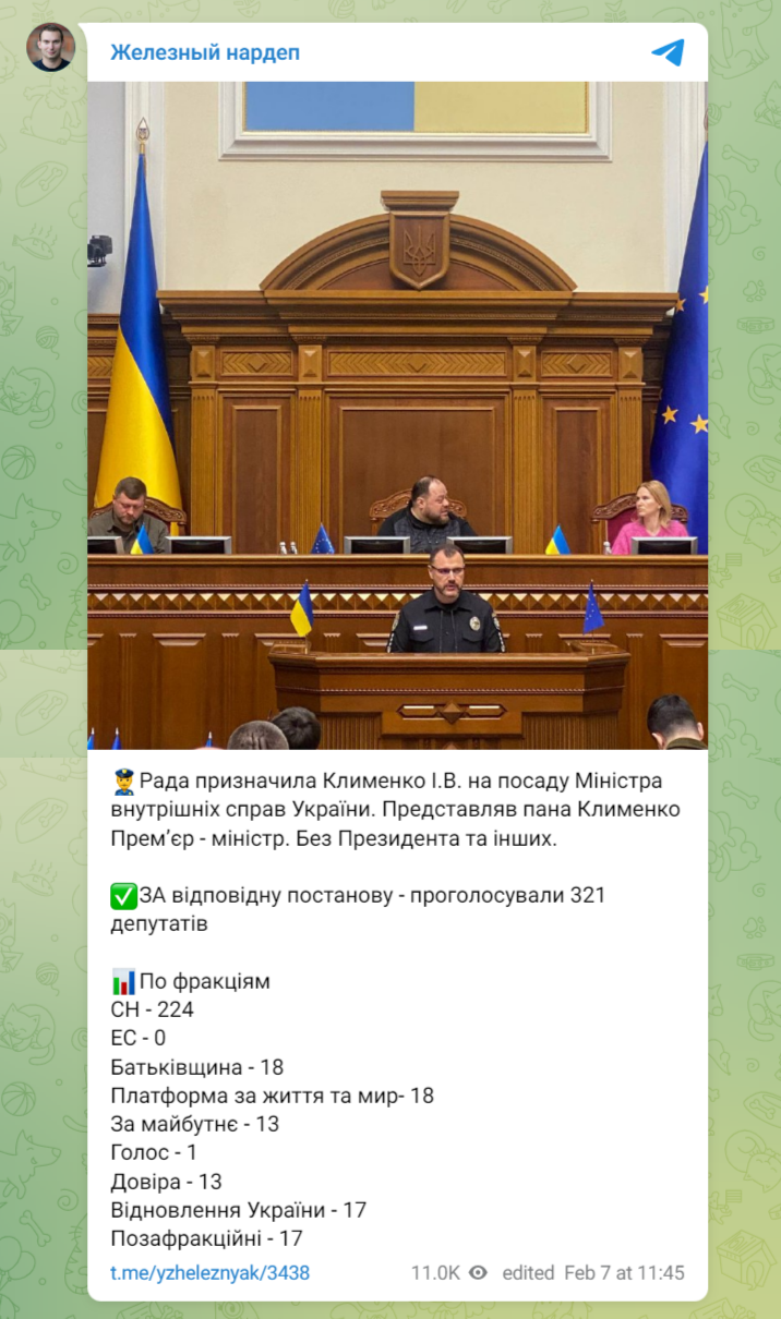 Напомним, что 6 февраля премьер-министр Украины Денис Шмыгаль подал в Раду представление о назначении Клименко министром внутренних дел.