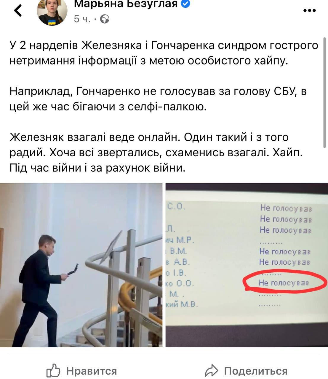 "У двух нардепов Железняка и Гончаренко синдром острого недержания информации с целью личного хайпа. Например, Гончаренко не голосовал за главу СБУ, в это же время бегая с селфи-палкой. Железняк вообще ведет онлайн. Один такой и с того же рад. Хотя все обращались, опомнись вообще. Хайп. Во время войны и за счет войны", — написала Безуглая.
