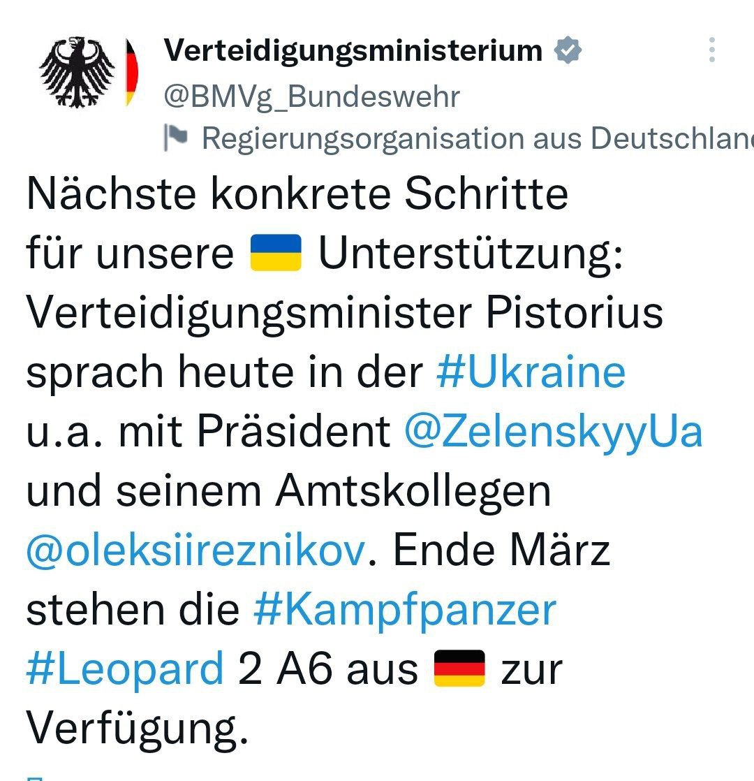 Немецкий Бундесвер сообщает, что первые танки Leopard 2 прибудут в Украину в конце марта.