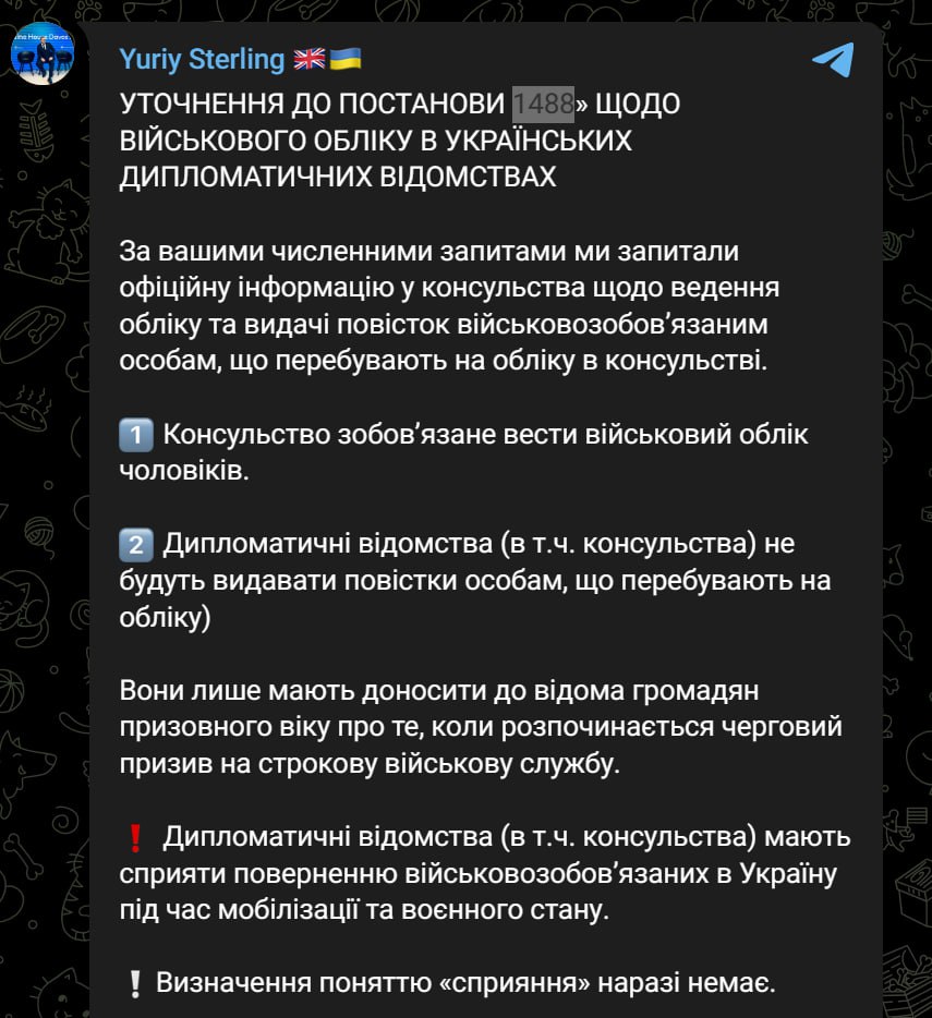 4. Также консульства должны способствовать возвращению военнообязанных в Украину во время мобилизации и военного положения.