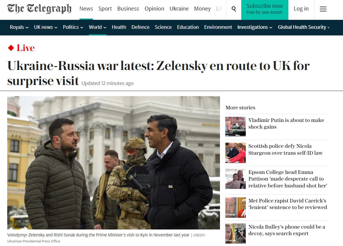 10.40 Президент Украины Владимир Зеленский направляется в Великобританию, чтобы посетить украинские войска, проходящие обучение в стране, и встретиться с Риши Сунаком на Даунинг-стрит, пишет The Telegraph.