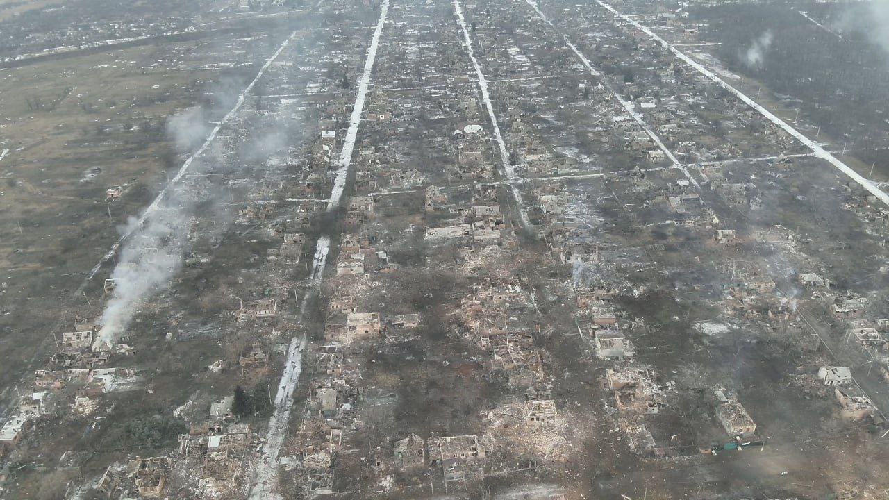 20:46 Вид фронтового Бахмута с воздуха. В городе продолжаются бои.