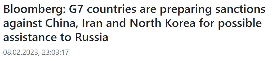 23:14 G7 обсуждает введение санкций к 24 февраля против компаний из Китая, Ирана и КНДР из-за поставок РФ компонентов и технологий, применяемых в военных целях.