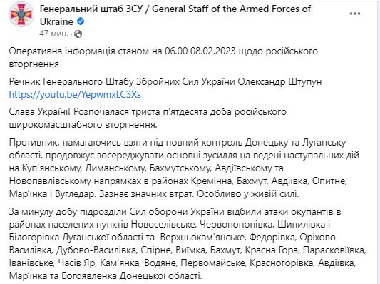 07.20 В среду, 8 февраля, Генштаб ВСУ обнародовал сводку о ситуации на фронте.