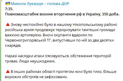 08.00 Ночью РФ выпустила два десятка снарядов по Никопополькому району Днепропетровской области.