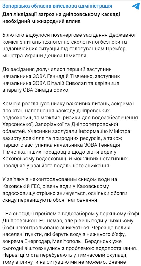 "Из-за этого большие населенные пункты, которые берут воду из нижнего бьефа, в частности Энергодар, Мелитополь и Бердянск, уже сегодня столкнулись с проблемой водоснабжения. Сейчас эти города находятся во временной оккупации, поэтому повлиять на ситуацию мы не можем", - заявил заместитель главы Запорожской ОВА Геннадий Тимченко.