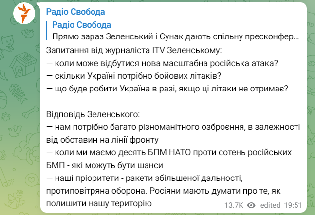 Об этом заявил президент Владимир Зеленский в Великобритании, отвечая на вопросы журналиста ITV, сообщает "Радио. Свобода".