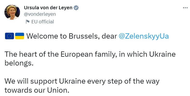 Она поприветствовала Зеленского в Брюсселе и написала, что ЕС будет поддерживать Украину "на каждом шагу на пути к нашему Союзу".