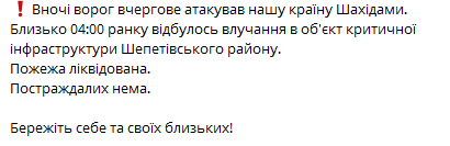 "Ночью враг в очередной раз атаковал нашу страну "Шахидами". Около 04:00 утра произошло попадание в объект критической инфраструктуры Шепетовского района.