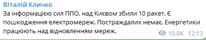 "Имеются повреждения электросетей. Пострадавших нет. Энергетики работают над восстановлением сетей", - добавил Кличко.