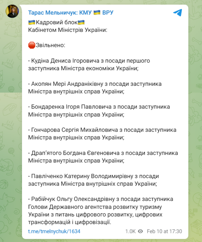 Кабмин в пятницу, 10 февраля, уволил пятерых заместителей министра внутренних дел и первого замминистра экономики.