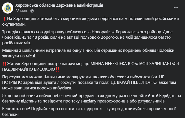 В Херсонской области автомобиль взорвался на российской мине. Есть погибшие.