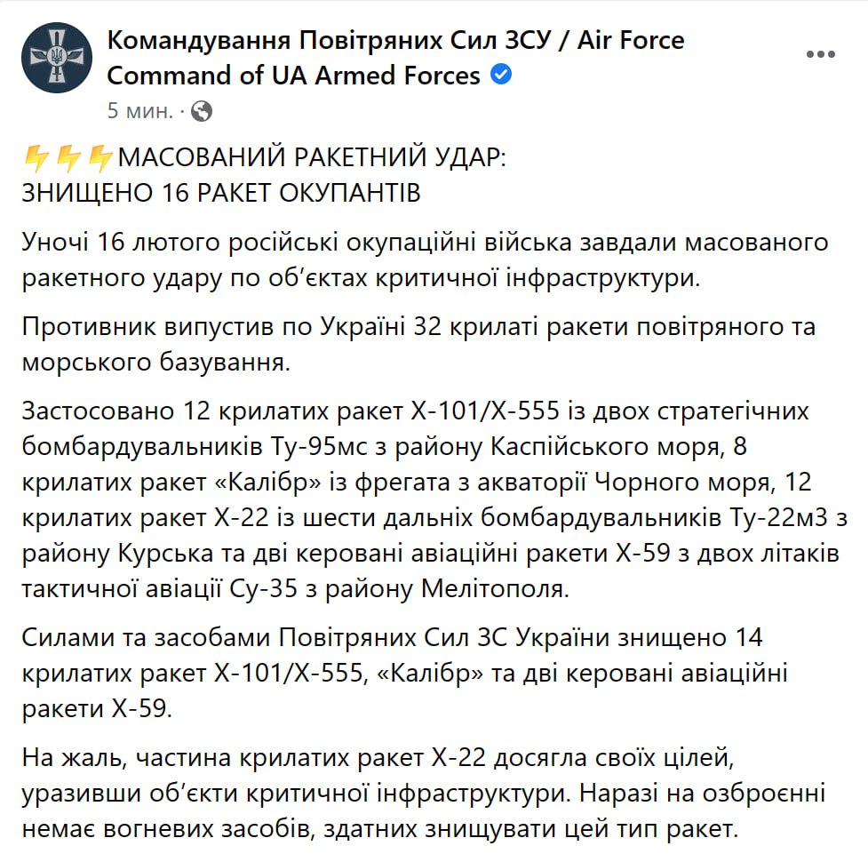 Во время массированного ракетного удара в ночь с 15 на 16 февраля россияне выпустили по Украине 32 крылатые ракеты воздушного и морского базирования, ВСУ уничтожили 16 из них.