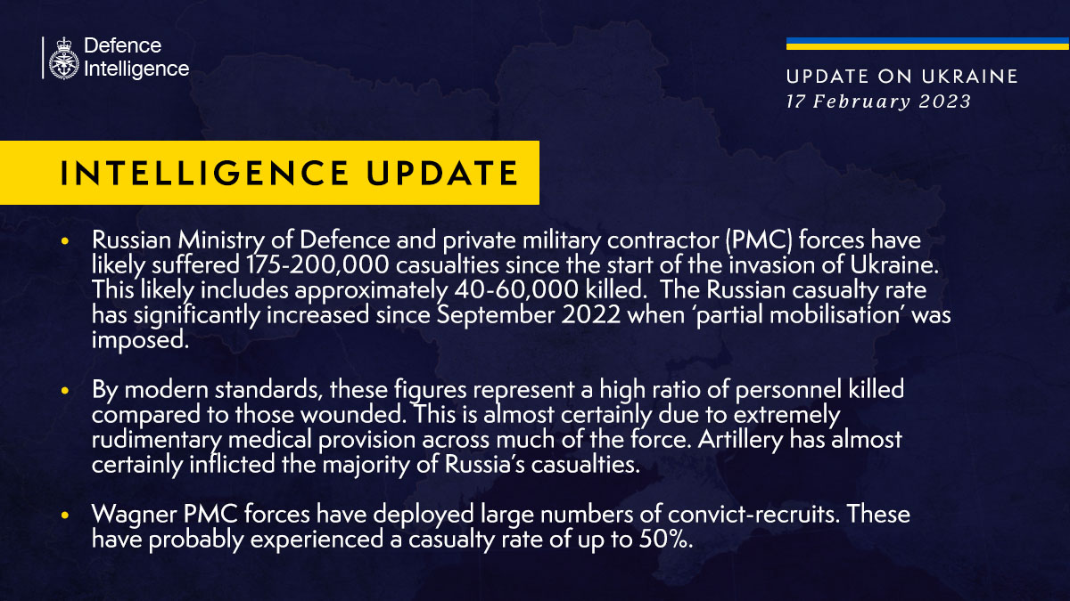 Силы Министерства обороны РФ и российских частных военных кампаний, вероятно, потеряли от 175 до 200 тыс. человек убитыми и ранеными с начала полномасштабного вторжения в Украину.