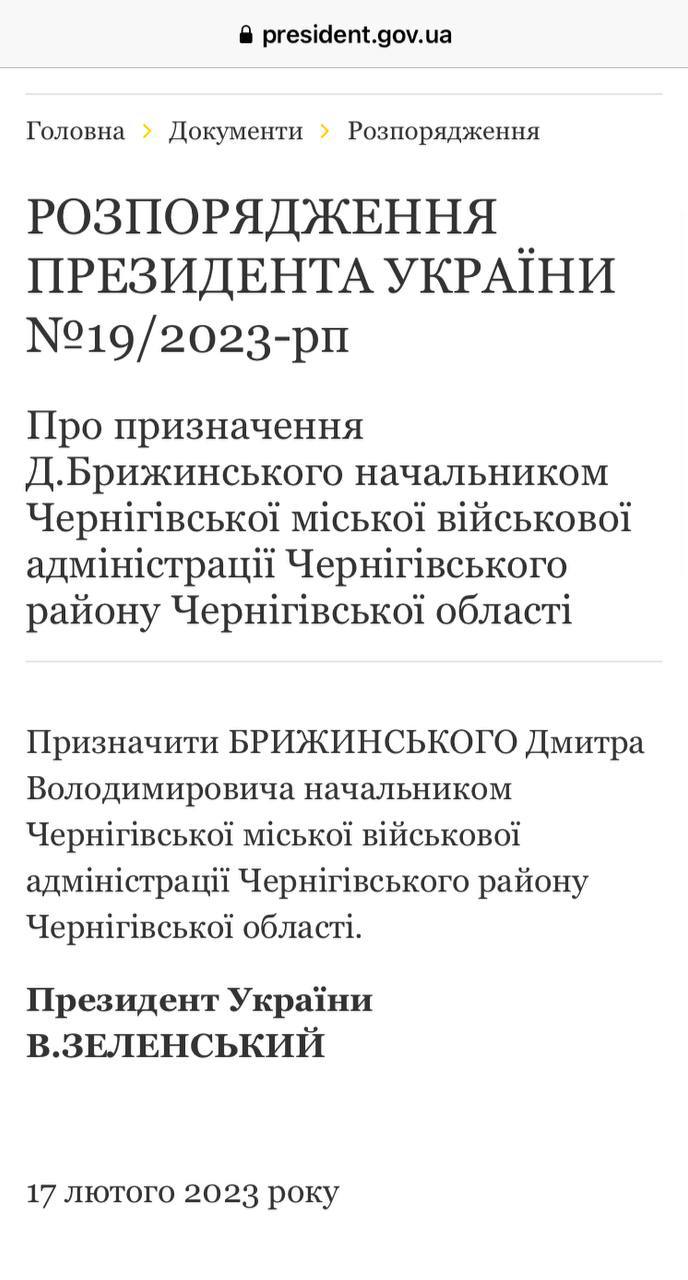 Президент Украины Владимир Зеленский назначил главой Черниговской городской военной администрации Дмитрия Брижинского, экс-командира 93-й механизированной бригады Холодный яр, как и писала вчера "Страна".