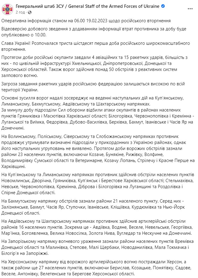 В воскресенье, 19 февраля, в Украине идет уже 361-й день войны с РФ.