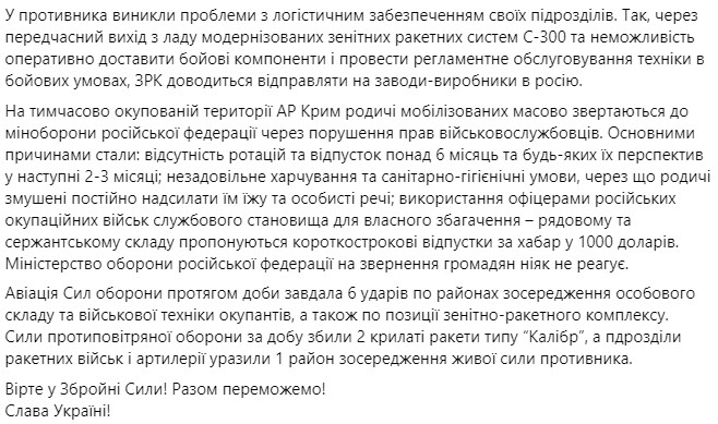 Противник нанес 9 ракетных и 11 авиационных ударов, есть погибшие и раненые среди гражданского населения. Выделяется мощный авиационный удар в районе Бахмута