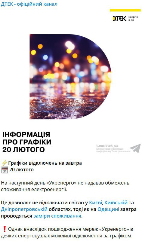 18:59 На завтрашний день "Укрэнерго" не предоставлял ограничения потребления электроэнергии, сообщает ДТЭК.