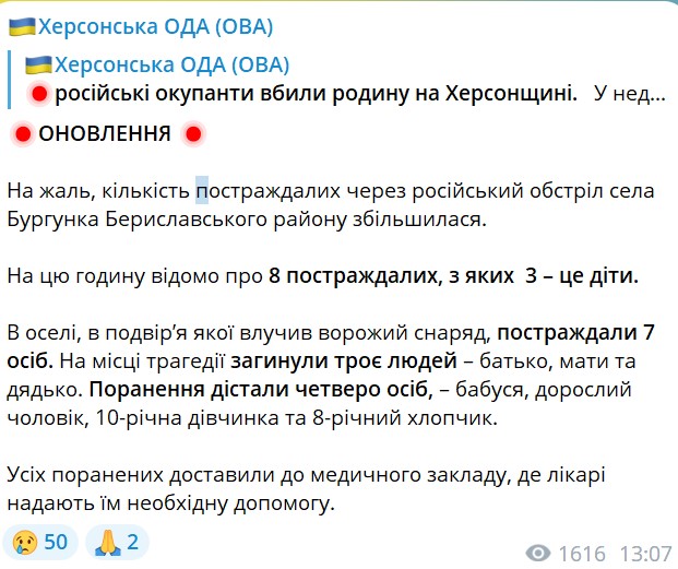 Кроме того, ОВА сообщает, что артиллерийский снаряд попал во двор жителей села Бургунка в Херсонской области. Погибли три человека. В момент обстрела в доме находились трое взрослых и двое детей. Мать, отец и дядя погибли на месте. Ранения получили четыре человека – бабушка, взрослый мужчина, 10-летняя девочка и 8-летний мальчик.