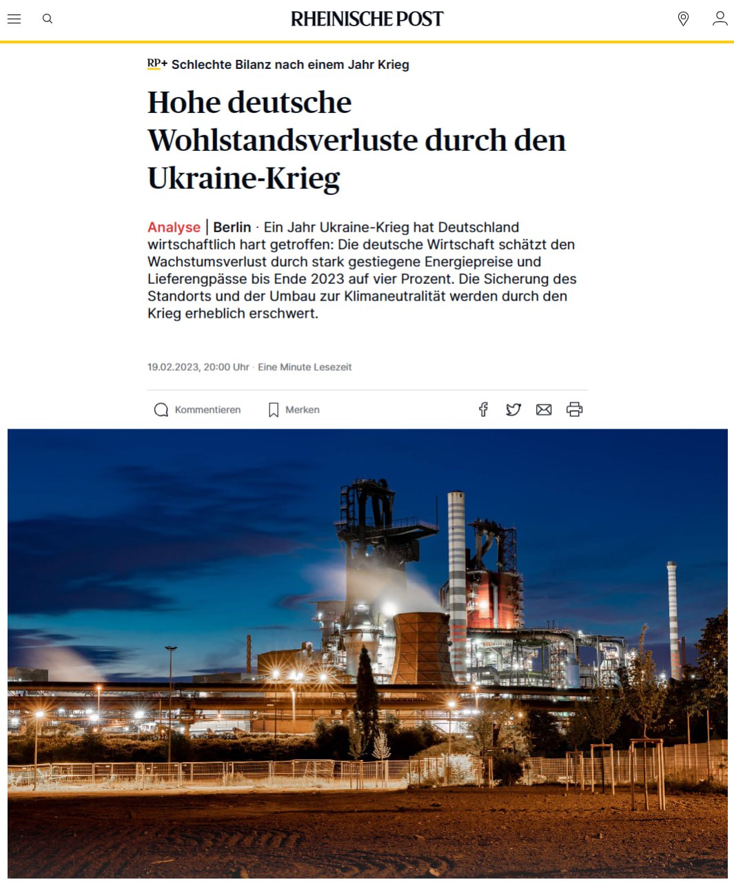 07.55 Год войны в Украине сильно ударил по Германии с экономической точки зрения: немецкая экономика может потерять четыре процента роста к концу 2023 года. Об этом пишет газета Rheinische Post.