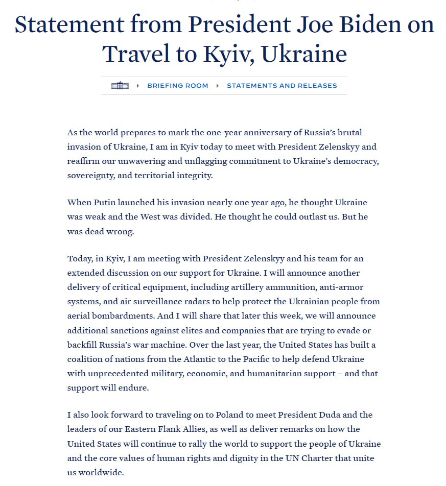 "Приближается годовщина жестокого вторжения России в Украину, и сегодня я нахожусь в Киеве, чтобы встретиться с президентом Зеленским и подтвердить нашу непоколебимую приверженность демократии, суверенитету и территориальной целостности Украины.