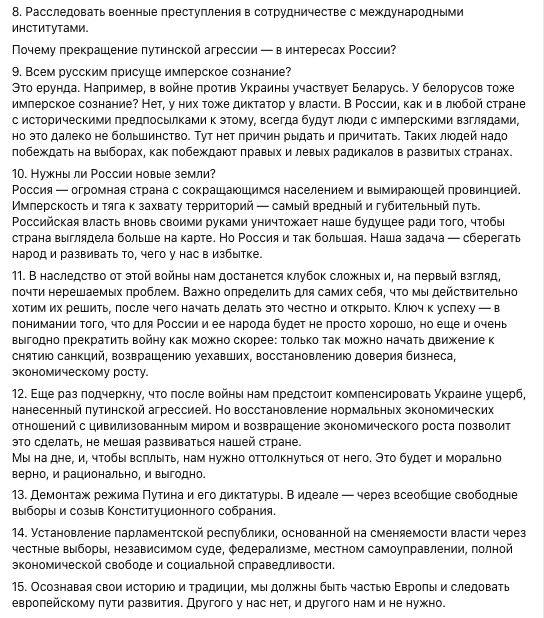 В ней впервые российский политик декларирует необходимость выполнения Россией всех требований Украины, включая вывод российских войск на границы 1991 года, компенсацию ущерба, причинённого войной Украине и расследование военных преступлений.