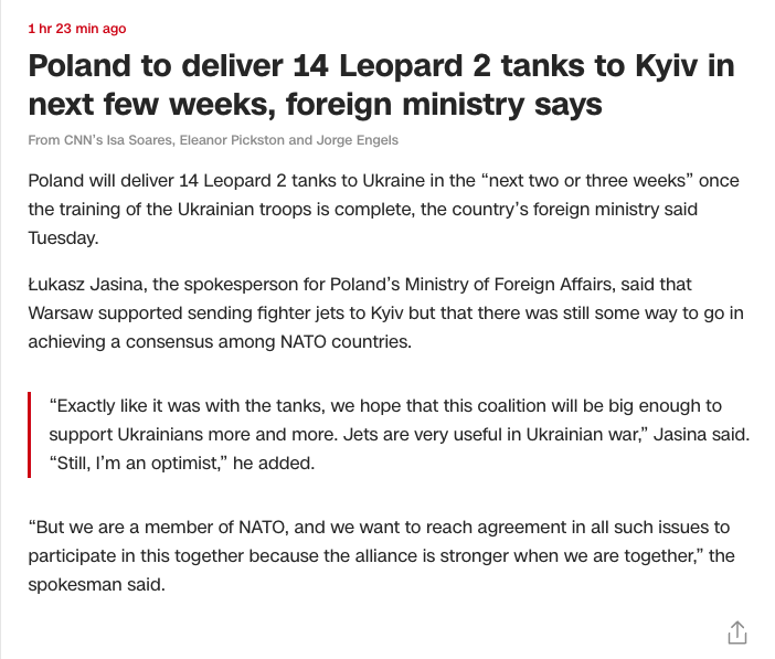Также сообщается, что Лукаш Ясина, пресс-секретарь МИД Польши, заявил: Варшава поддерживает отправку истребителей в Киев, но еще предстоит пройти определенный путь для достижения консенсуса между странами НАТО.