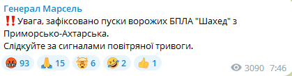 "Внимание, зафиксированы пуски вражеских БПЛА "Шахед" из Приморско-Ахтарска. Следите за сигналами воздушной тревоги", - пишет Мельник.
