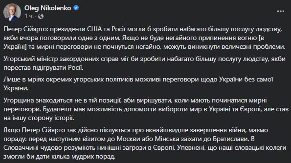 "Венгерский министр иностранных дел мог бы оказать намного большую услугу человечеству, если бы перестал подыгрывать России. Только в мечтах отдельных венгерских политиков возможны переговоры по Украине без самой Украины", - заявил Николенко.