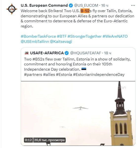 Бомбардировщики взяты из состава пятого авиакрыла с базы Майнот, штат Северная Дакота. Перед прибытием на авиабазу Морон в Испании два B-52 после трансатлантического перелета в пятницу совершили пролет над Эстонией в рамках мероприятий, посвященных дню ее независимости.