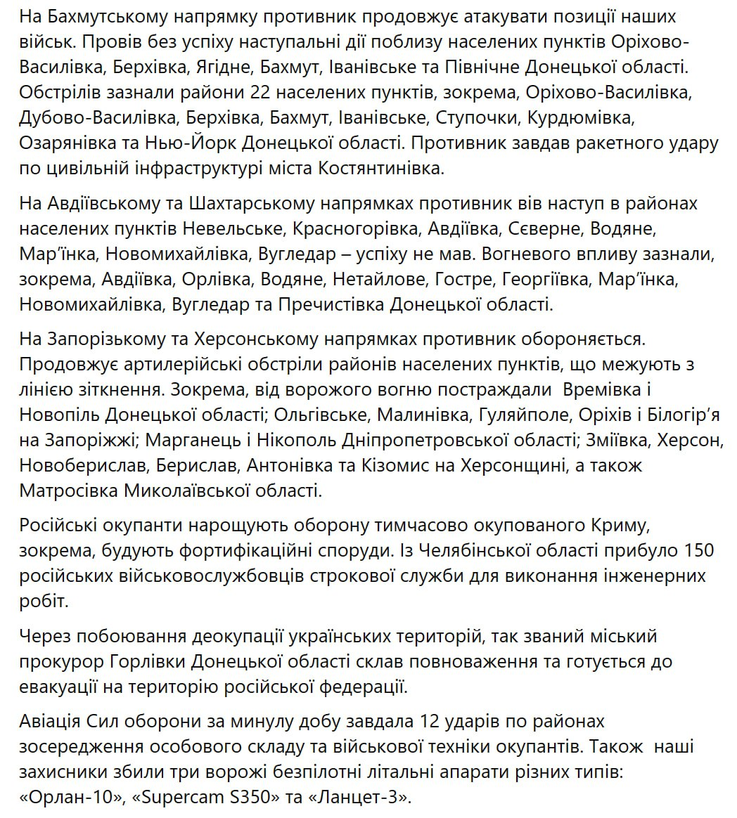 - На Бахмутском направлении РФ продолжает безуспешно атаковать вблизи населенных пунктов Орехово-Васильевка, Берховка, Ягодное, Бахмут, Ивановское и Северное Донецкой области.