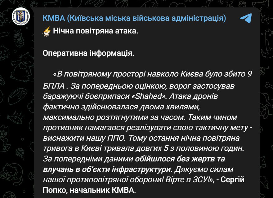 "По предварительной оценке, враг применил барражирующие боеприпасы "Shahed". Атака дронов фактически осуществлялась двумя волнами, максимально растянутыми по времени. Таким образом противник пытался реализовать свою тактическую цель – истощить нашу ПВО. Поэтому последняя ночная воздушная тревога в Киеве длилась пять с половиной часов", - рассказал Попко.
