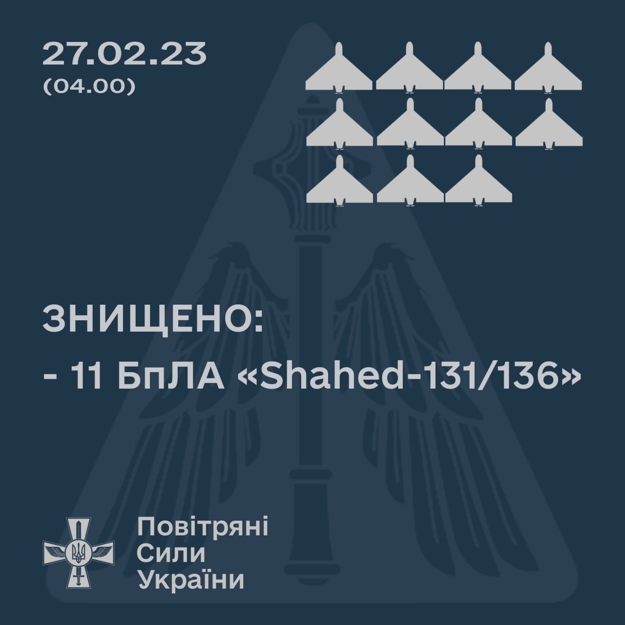 За ночь по Украине было выпущено до 14 дронов-камикадзе, одиннадцать из которых были уничтожены.