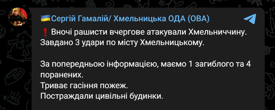 Также стало известно, что ночью три удара были нанесены по Хмельницкому. Об этом сообщил губернатор области Гамалий.