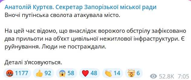 Секретарь Запорожского горсовета Анатолий Куртев уточнил, что было зафиксировано два прилета в городе. Под удар попал объект гражданской нежилой инфраструктуры. Обошлось без жертв.