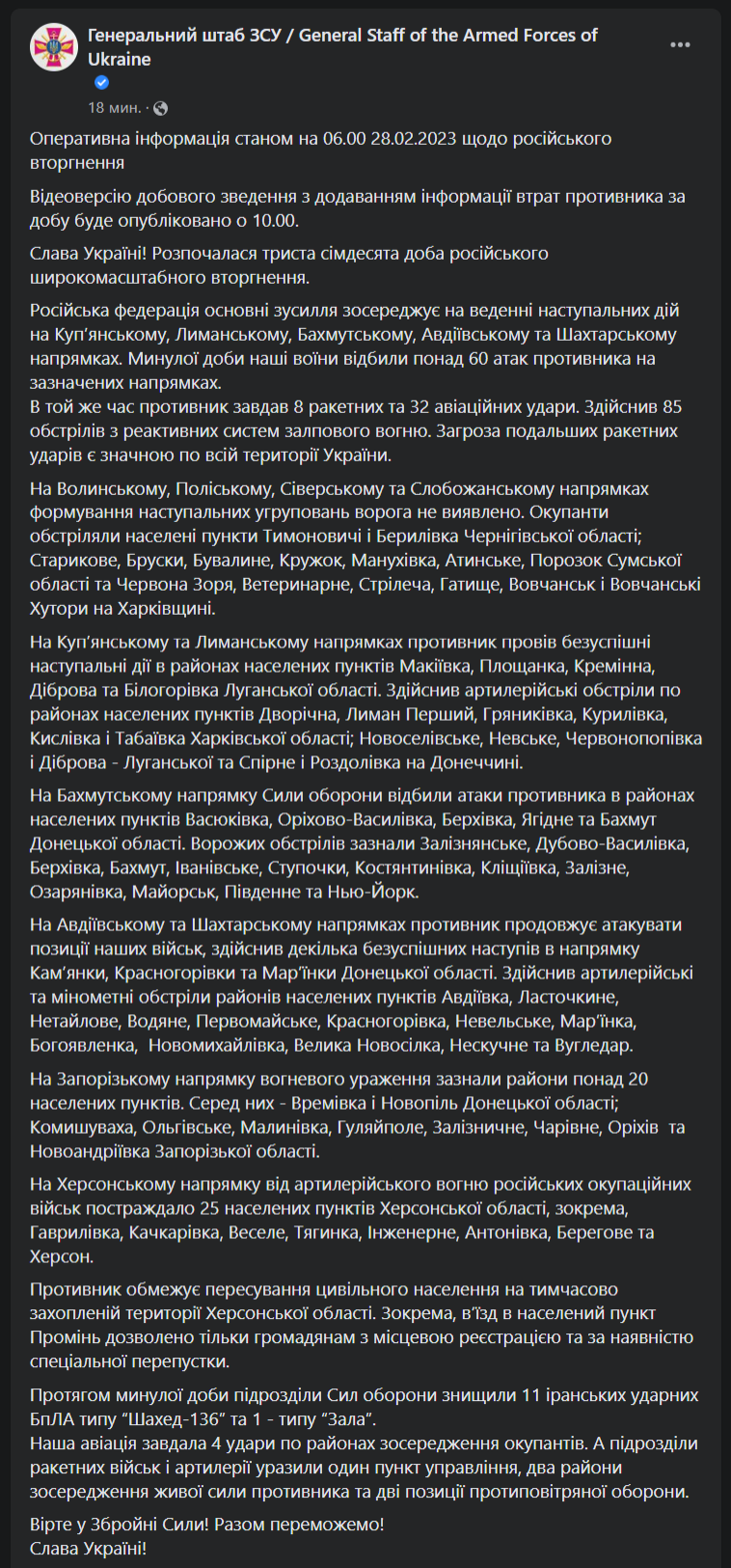 06:55 Сводка украинского Генштаба на утро 28 февраля.