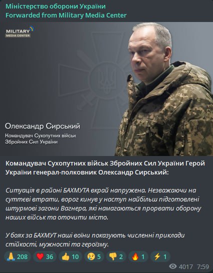 21.25 Командующий Сухопутными войсками Сырский принял решение о перемещении дополнительных подразделений в Бахмут.