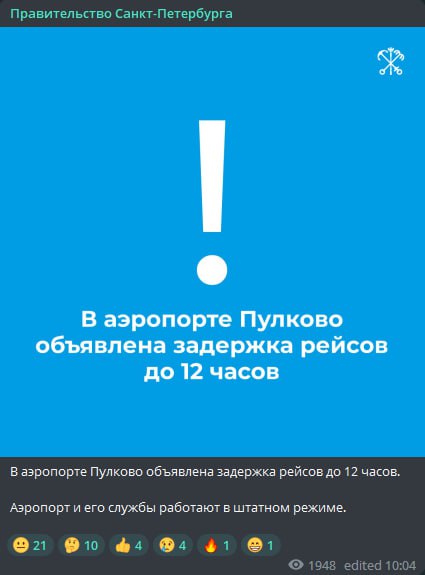 10:19 Петербургский аэропорт "Пулково" временно не принимает самолеты, сообщается в официальном Telegram-канале правительства города.