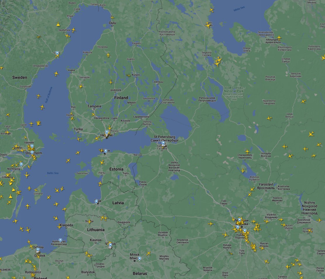 10:31 Небо над Петербургом сейчас выглядит так. Судя по сервису Flightradar24, над городом и областью нет самолетов.
